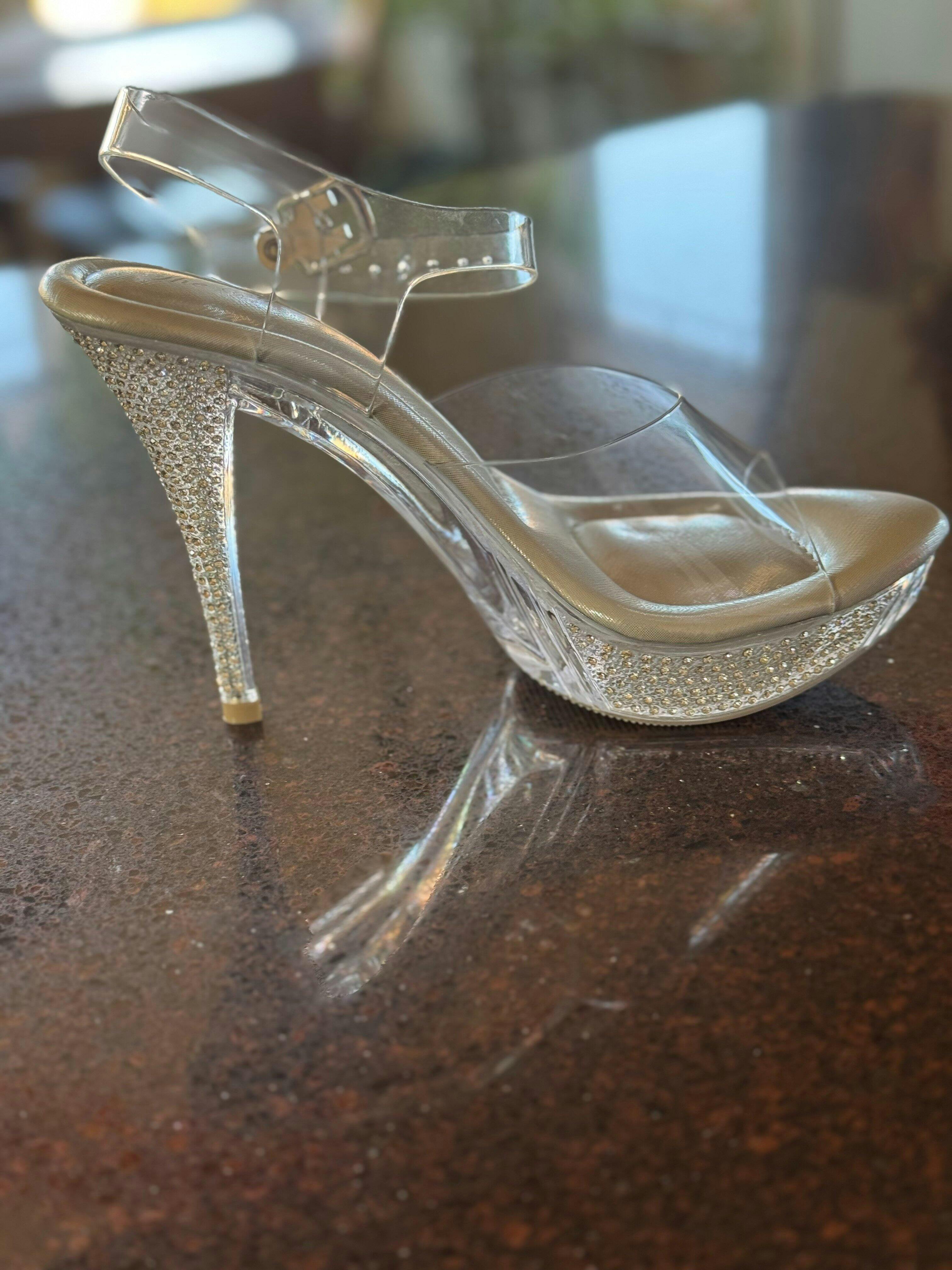 Features:  4.5" heel and 1" platform, synthetic sparkly insole (easy to clean), scattered clear rhinestones on the platform and heel, curved platform, flexible/soft plastic upper, cushioned insole for amazing comfort, ankle strap, vegan heels, gray bottoms for an ultra sleek finish
